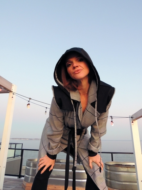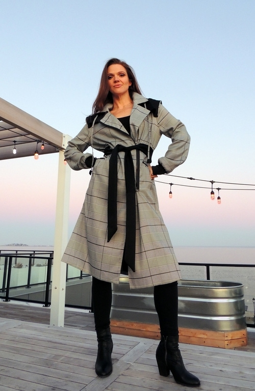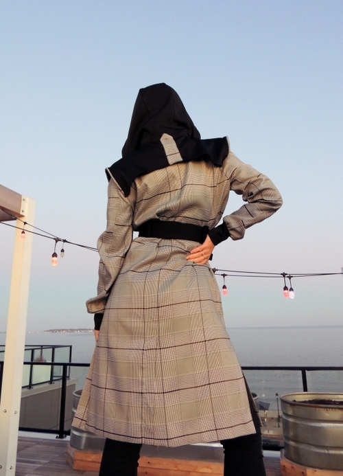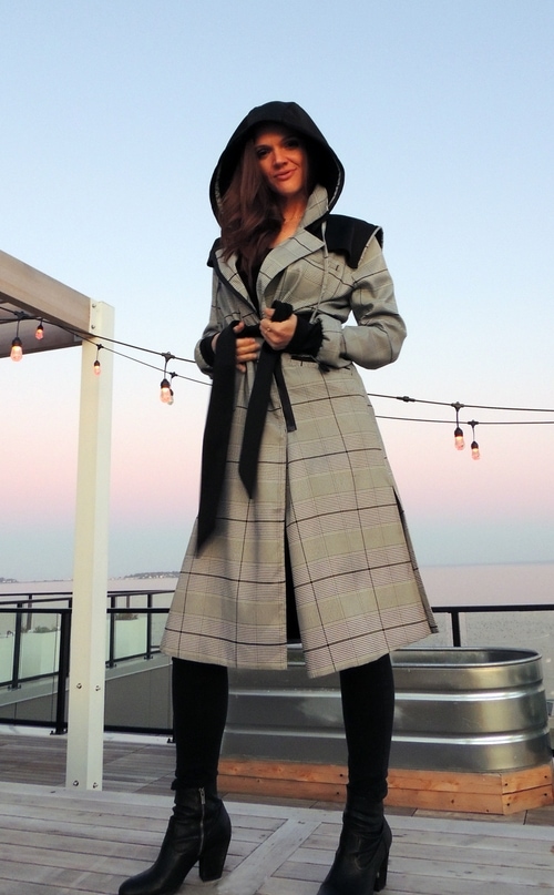 Womens trench coat is light weight and fully lined. Black resin off-set zipper for side/front closure also with hidden inside button snaps. Partially fixed belt to allow cinch at waist. Fitted spandex cuff at wrist. Non-removable hooded cape with ties and plaid trim/piping. Asymmetrical zipper details. Two front side pockets.