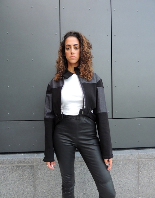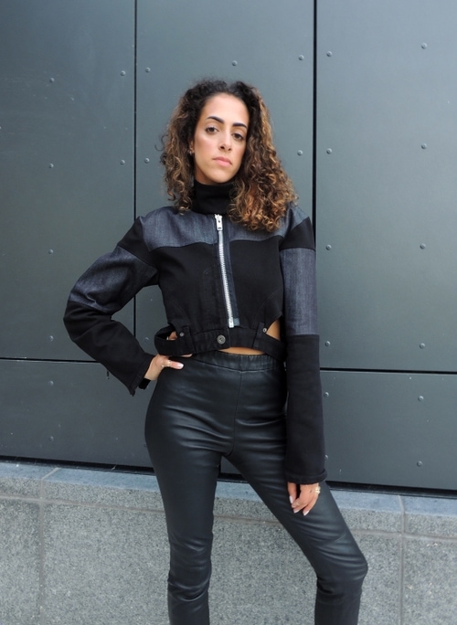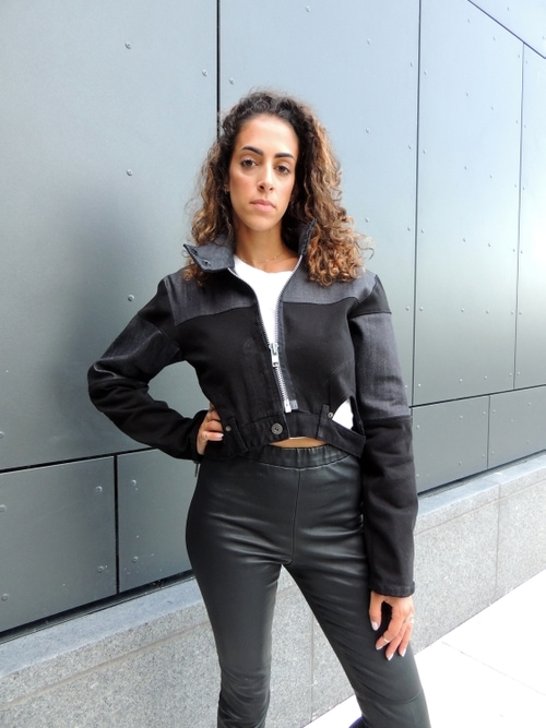 Womens cropped two-tone black and dark navy denim jacket. Silver zipper and button center closure with snaps at collar. Cut out sides and back details. Zippers on each sleeve. Drop sleeve and over-sized look. No pockets.