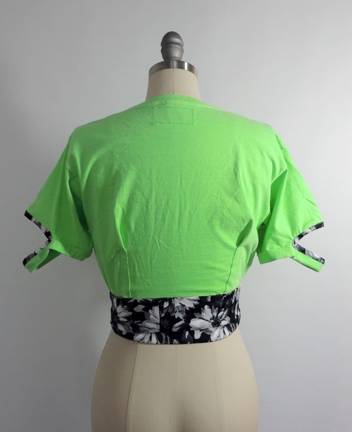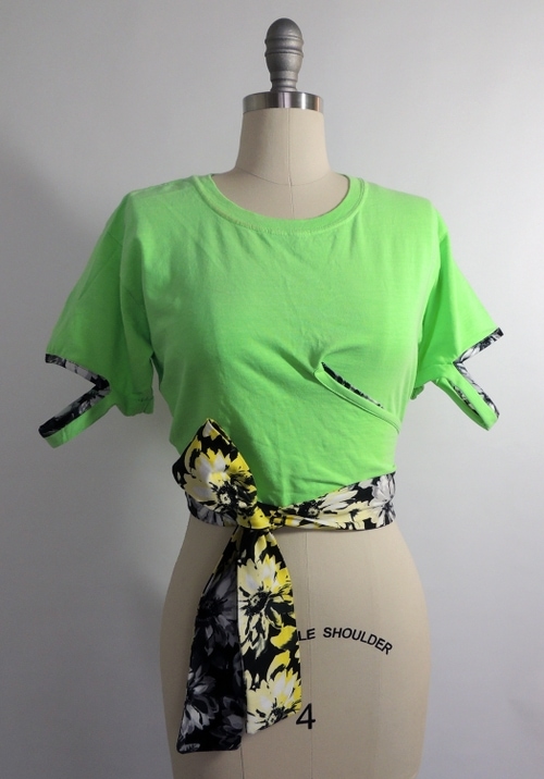 Womens two-way wrap tee with cut out sleeve hems. Floral printed fabric piping and waist band wrap details. Cross over one way to show more lime or the other to show more floral print around waist.