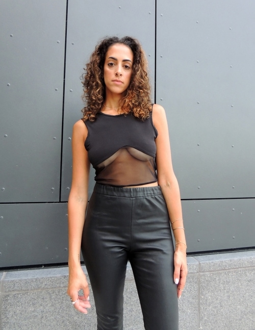 Four-way stretch crop top with sheer stretch bottom, sleek binding around edges, and bust area is lined. Show off that under-boob with this sexy crop top. It's constructed of athletic swim wear that can double as a cute night-out look or a sleek swimwear top.
